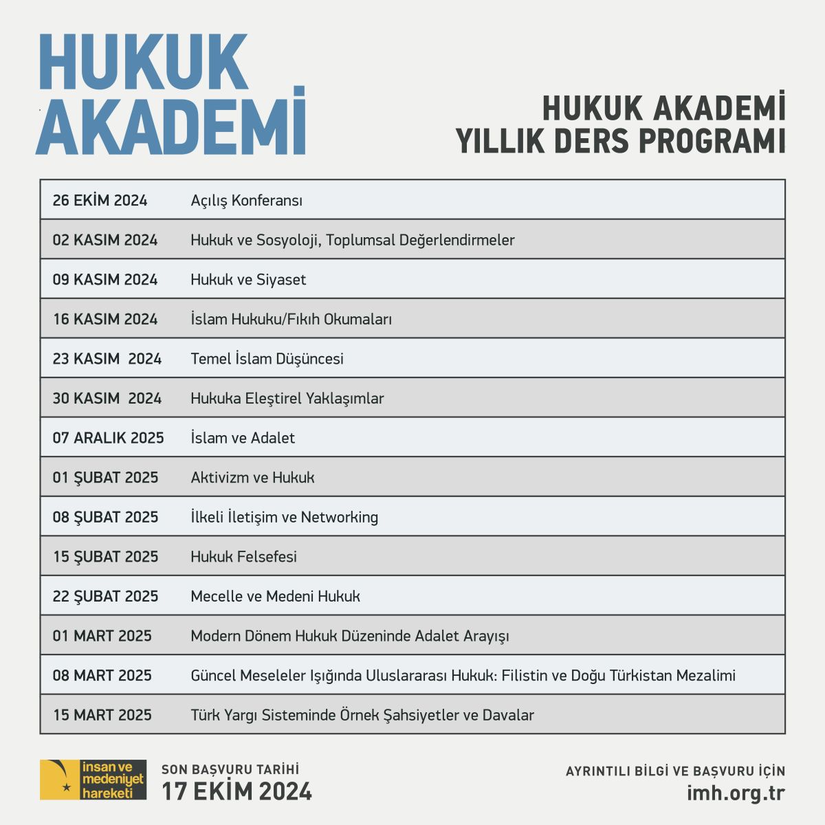 Hukuk Akademi programı; adaleti, ilmin ameli; ilmi, adaletin harcı olarak kabul eden ve "Toplumun Takva Ekseninde Değişimini" sağlamak gayesiyle mücadele eden İnsan ve Medeniyet Hareketi bünyesinde yürütülecektir.