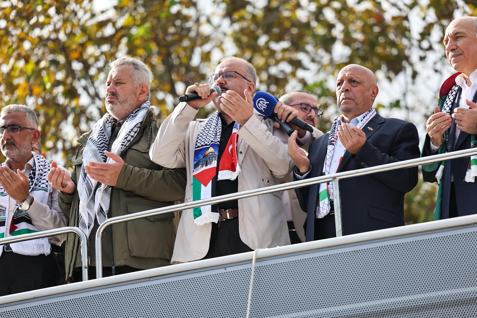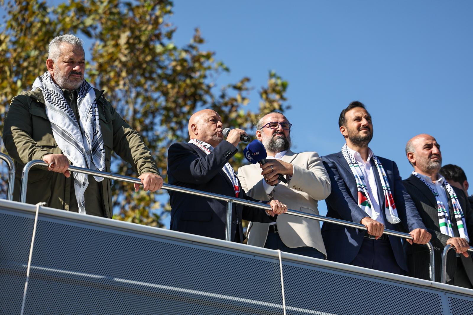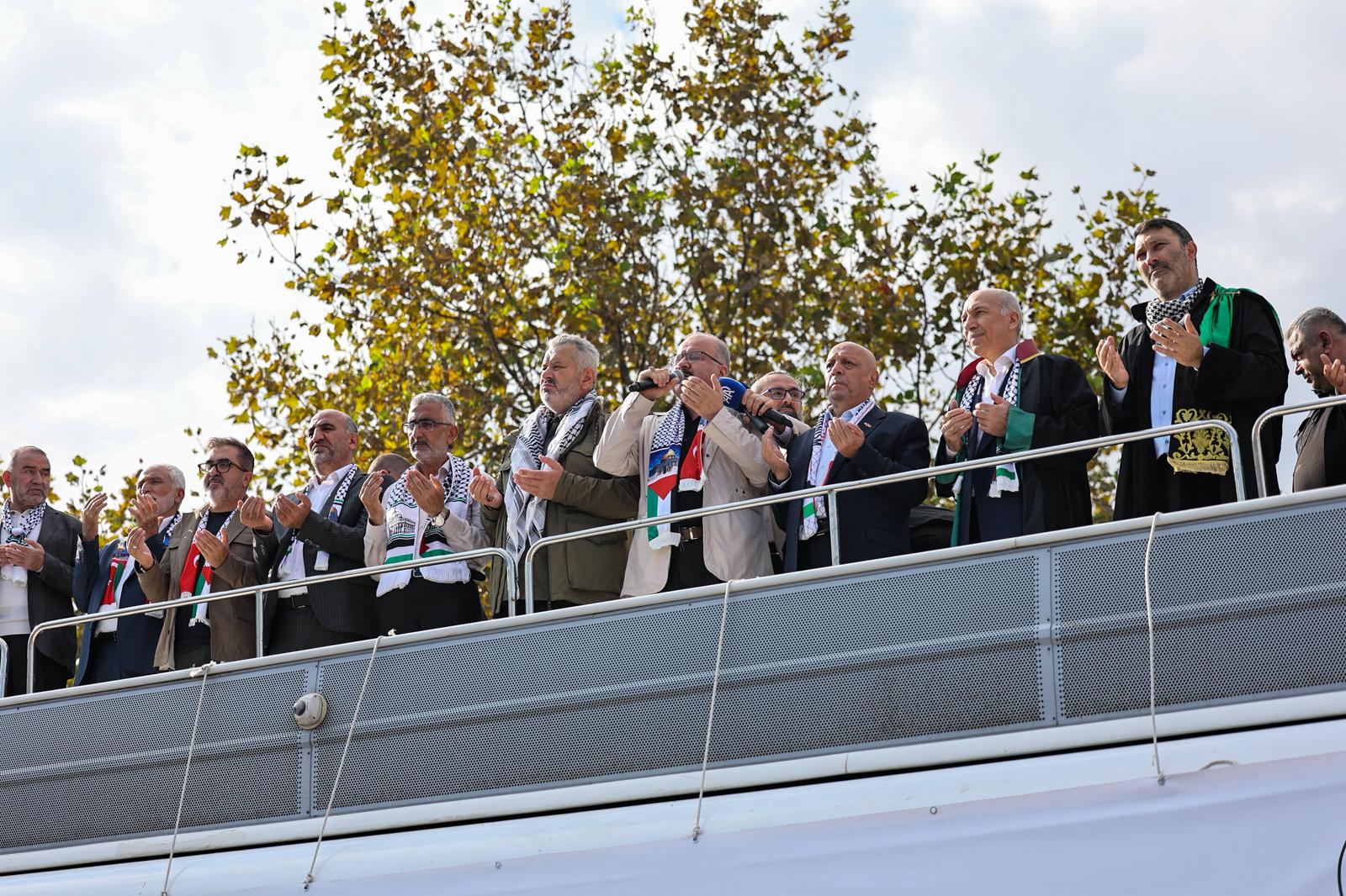 Konuşmasında 729 gündür süren saldırılarda 65 binden fazla masum insanın hayatını kaybettiğini hatırlatan Arslan, “Filistin davası sadece Filistinlilerin ya da Müslüman ülkelerin davası olmaktan çıkmıştır; Filistin davası bir insanlık davasıdır. İnsanlık koalisyonunda ‘Filistin’ diye haykıran bütün mazlumlara teşekkür ediyoruz. Onlarla dayanışmamızı daha da güçlendireceğiz. Bu toprakların ayrı bir sorumluluğu var. Biz duymasak da görmesek de uzak kalsak da onlar bizi biliyor ve bu toprakları gözünü açmış bekliyor. Yolumuz açık, yürüyüşümüz Gazze, Aksa ve Kudüs olsun.” dedi.