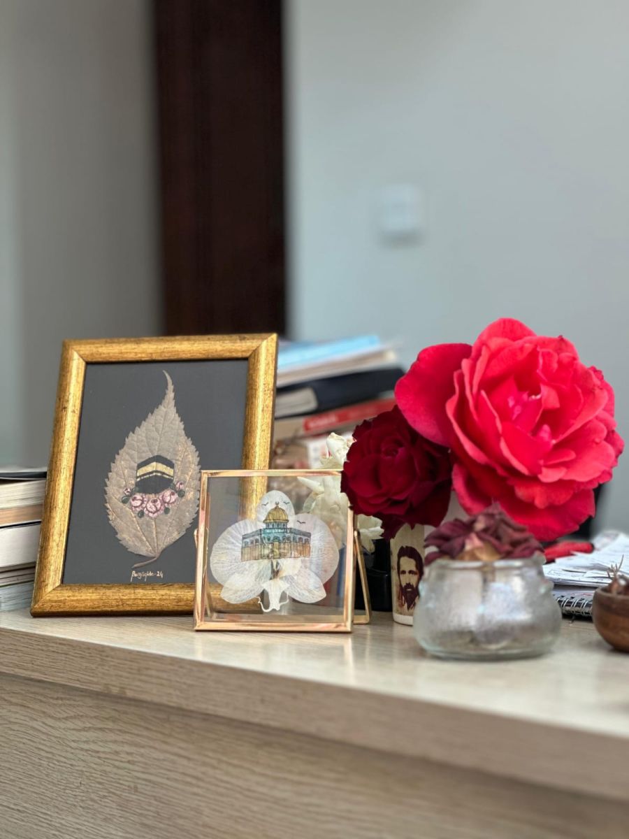 Benim ağaçla, yaprakla ilgili; tabiata tutkun biri olduğumu anlayınca kendisi de bundan esinlenerek idareci olduğu yurtta mütevazı bir tabiat köşesi oluşturmuş. Tabiat köşesinin fotoğrafını gönderdi, sevindim ben de... Aradan bir zaman geçti. Yayınevinde her cuma namazı sonrası olduğu gibi yine üniversiteli öğrenciler vardı. Hep beraber simitle birlikte çayları yudumluyorduk. Hasan Aycın abimiz de cuma misafirimizdi. Elinde küçük bir kutuyla hanım kardeşimiz sohbetimizin bir yerinde kapıdan girdi. İçerisi kalabalık olduğu için durmadı, hediyesini vererek çıktı. Çay simit ve sohbet faslı bitene kadar kutuyu açmadım ama merakım son safhadaydı. Fiyonku çözüp kutuyu açınca karşıma nadide bir çalışma çıktı. Hediye, ince bir işçilikle çalışılmış, Mescidi Aksa'nın üzerinde özgürce uçan kuşların olduğu, Kudüs'ü simgeleyen bir eserdi. İtinayla kurutulan beyaz orkide çiçeğinin üzerine özgün bir tezhip çalışması nakşedilmişti. Dikkatle bakıldığında Mescidi Aksa'nın alnında çok ince bir hatla "Lailaheillalah" yazısı göze çarpıyordu. O kadar beğendim ki, bakır çerçevesi ile hâlâ masamın en görünür yerini süslemekte.