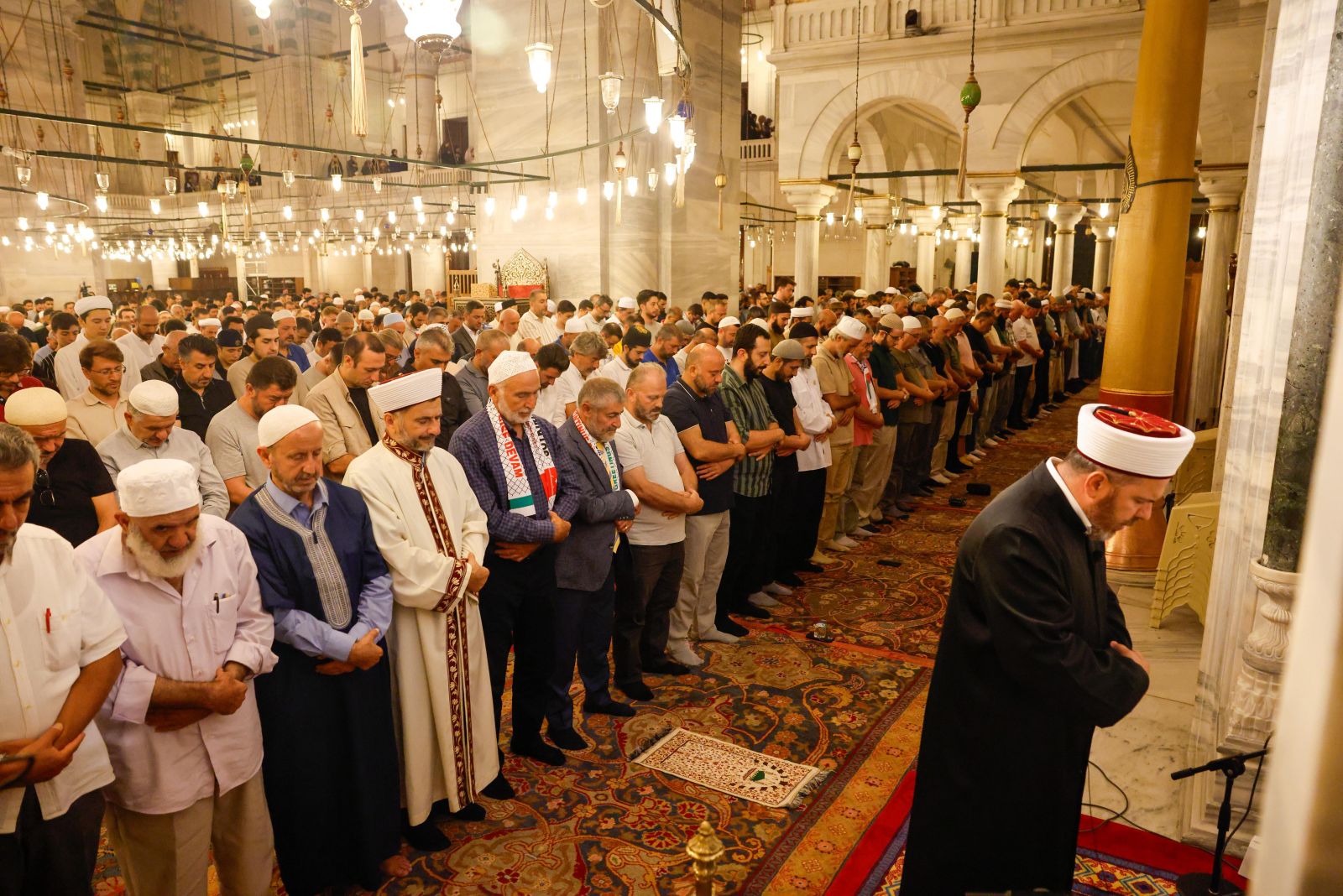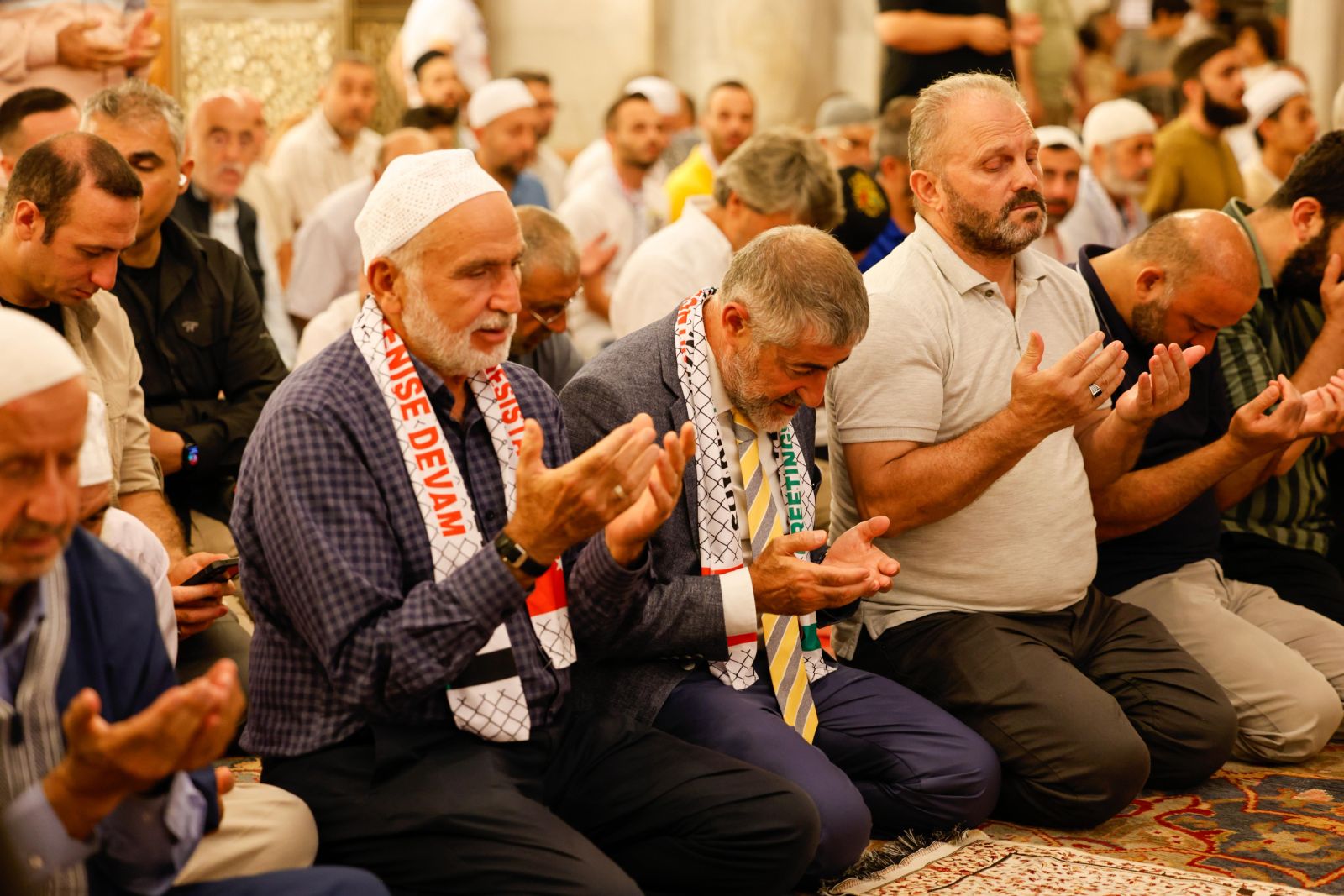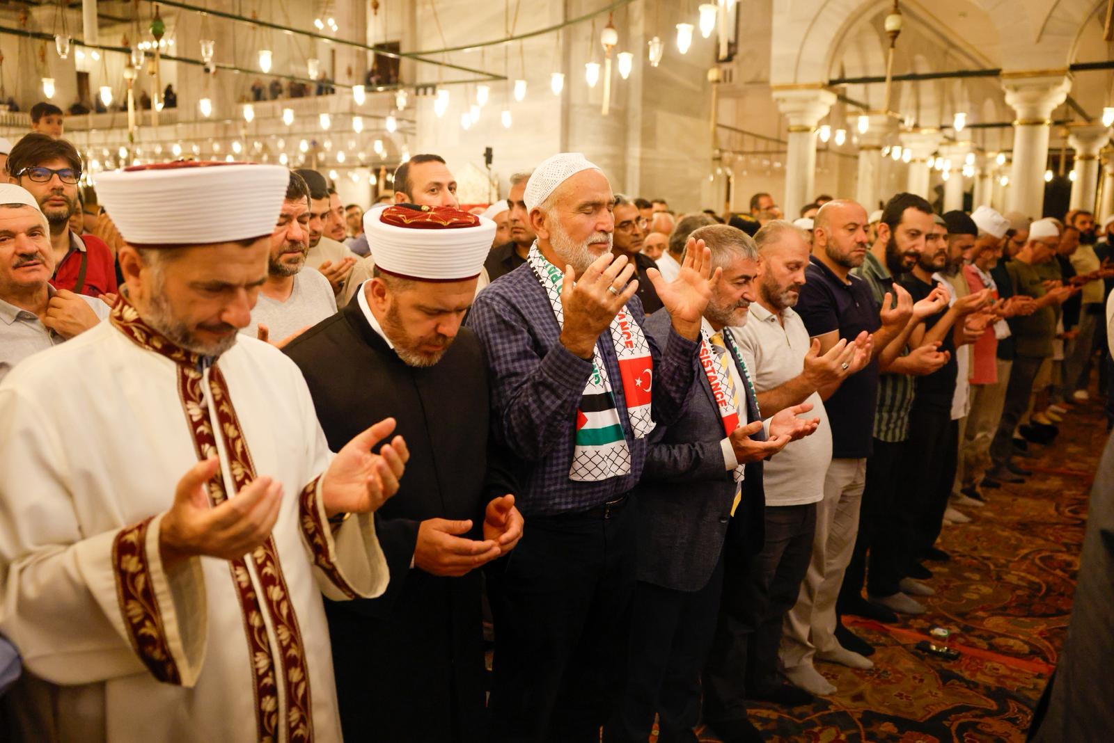 Fatih Camii İmam Hatibi Galip Usta, duasında Filistinlilerin imanı ve sabrının tüm dünyaya örnek olduğunu vurguladı. “Mü’minler ancak kardeştir” ayetinin Müslümanların birlik ve beraberliğine vesile olmasını dileyen Usta, Ayasofya’nın özgür olduğu gibi, Müslümanların üç hareminden biri olan ve miraç hadisesine tanıklık eden Mescid-i Aksa’nın da özgürlüğe kavuşması için dua etti. Usta, Filistin’de şehit edilen masumları, yaşlıları ve çocukları da anarak duasını tamamladı.