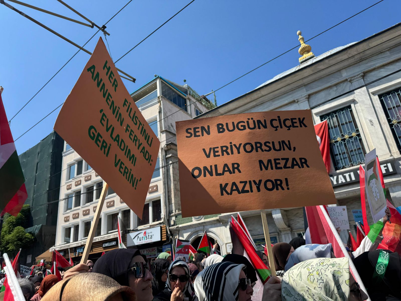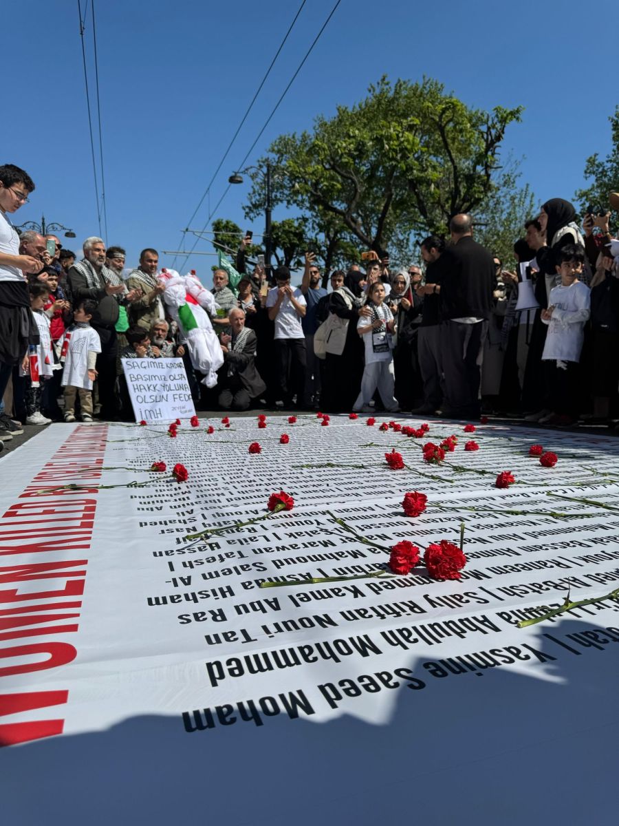Gazze’de katledilen annelerin isimlerinin yazılı olduğu pankarta, Anneler Günü dolayısıyla karanfiller bırakıldı.
