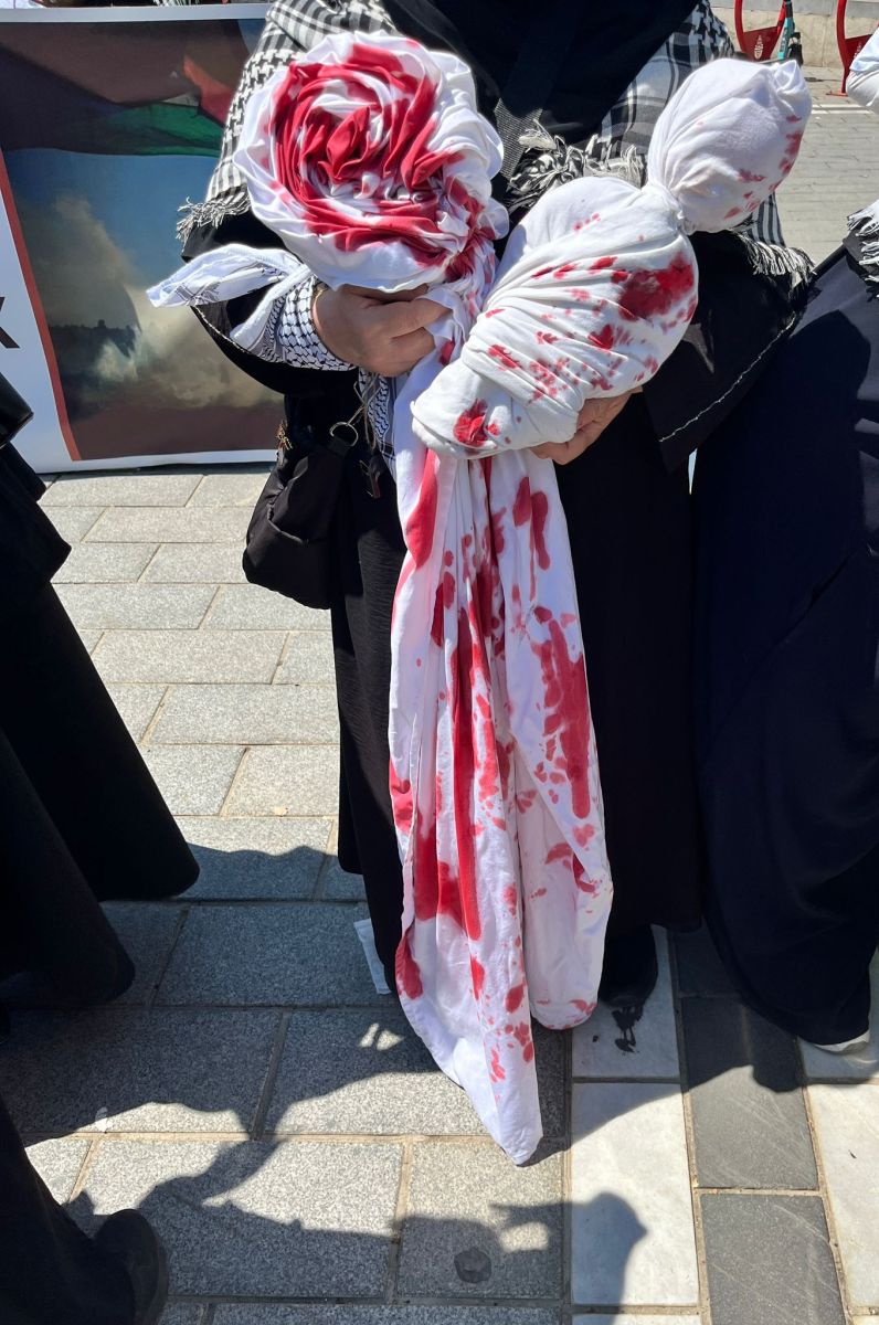 Kadınlar, Gazze'de İsrail tarafından hayatını kaybeden bebekleri temsilen kanlı kefenlere sarılı oyuncaklar taşıdı.
